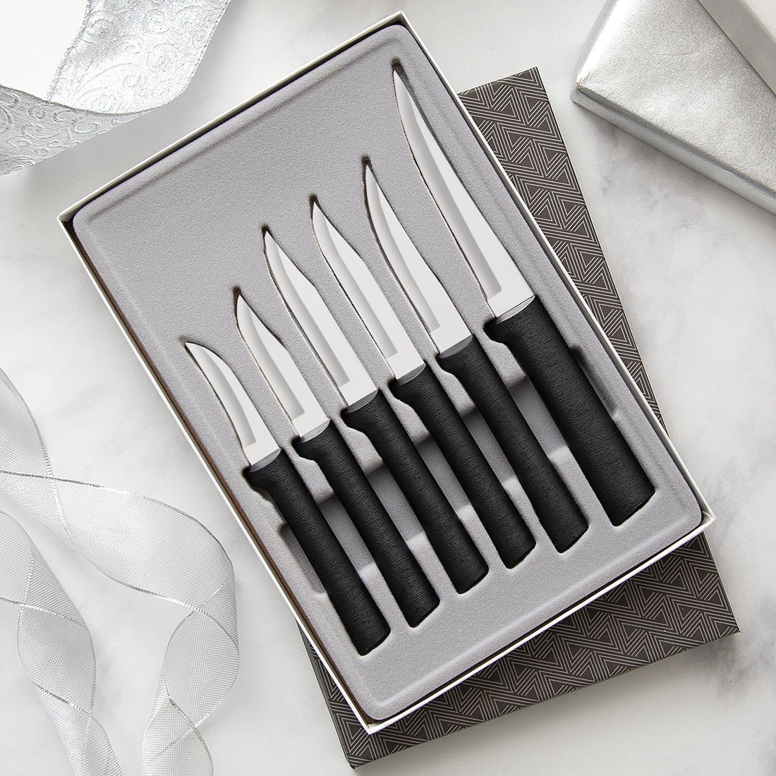 To assure customers get the best knives available, all Rada blades are crafted from surgical-quality, T420 high-carbon stainless steel for a lifetime of durability then hollow ground for incredible sharpness. When needed, non-serrated, hollow-ground blades can be easily resharpened using Rada’s Quick Edge Knife Sharpener. All pieces in this set except the Serrated Regular Paring knife can be sharpened.