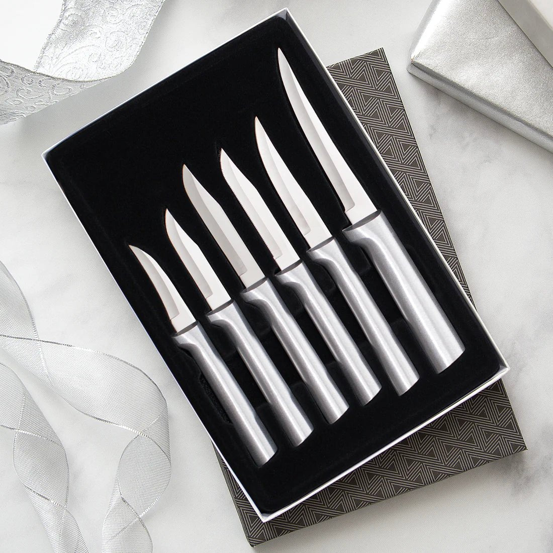 The All-Star Paring Gift Set includes six knives, from Rada's smallest Granny Paring to Rada's largest Super Parer and just about everything in between—Peeling Paring, Regular Paring, Serrated Regular Paring, and Heavy Duty Paring. Combining these outstanding performers into one must-have set makes a perfect addition to every kitchen.