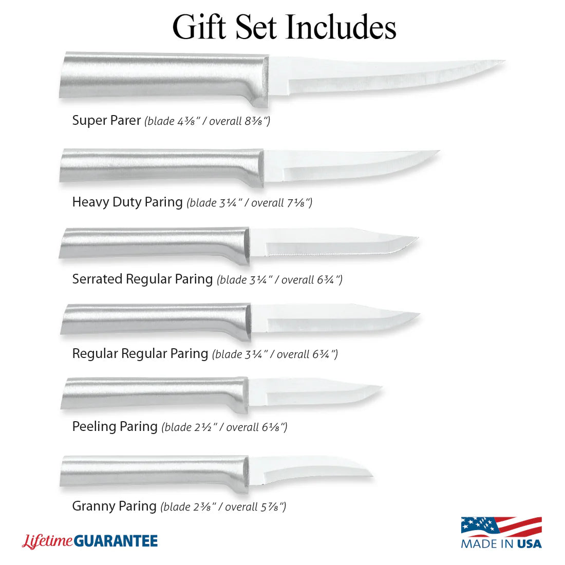 - This set includes six handy paring knives: Granny Paring, Peeling Paring, Regular Paring, Serrated Regular Paring, Heavy Duty Paring, and Super Parer.